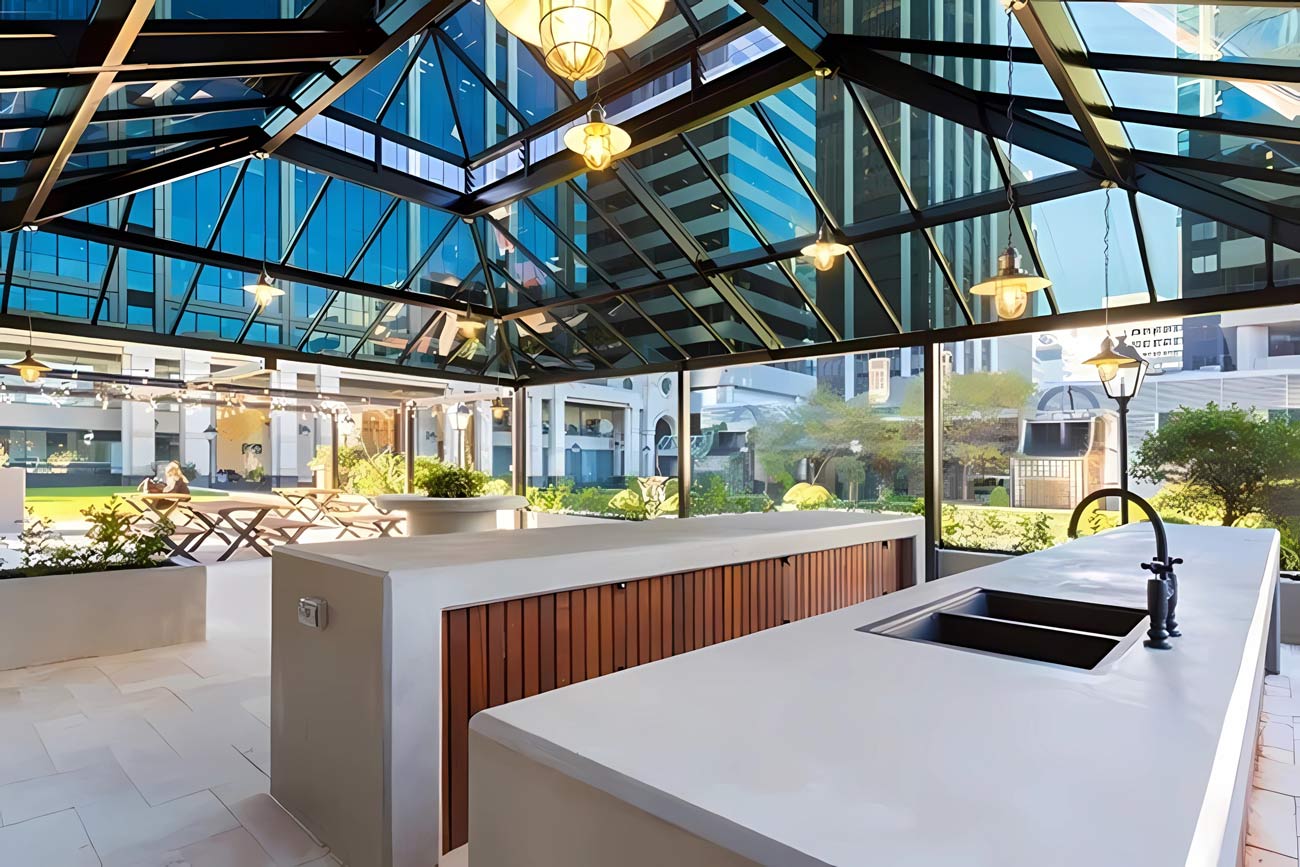 While our focus was on the lighting and glasshouse works, the result is a seamless integration of nature, structure, and subtle technology — creating a refined, welcoming environment that’s both beautiful and functional. Surrounded by lush landscaping and considered design, the space now serves as a green retreat for tenants and visitors alike.